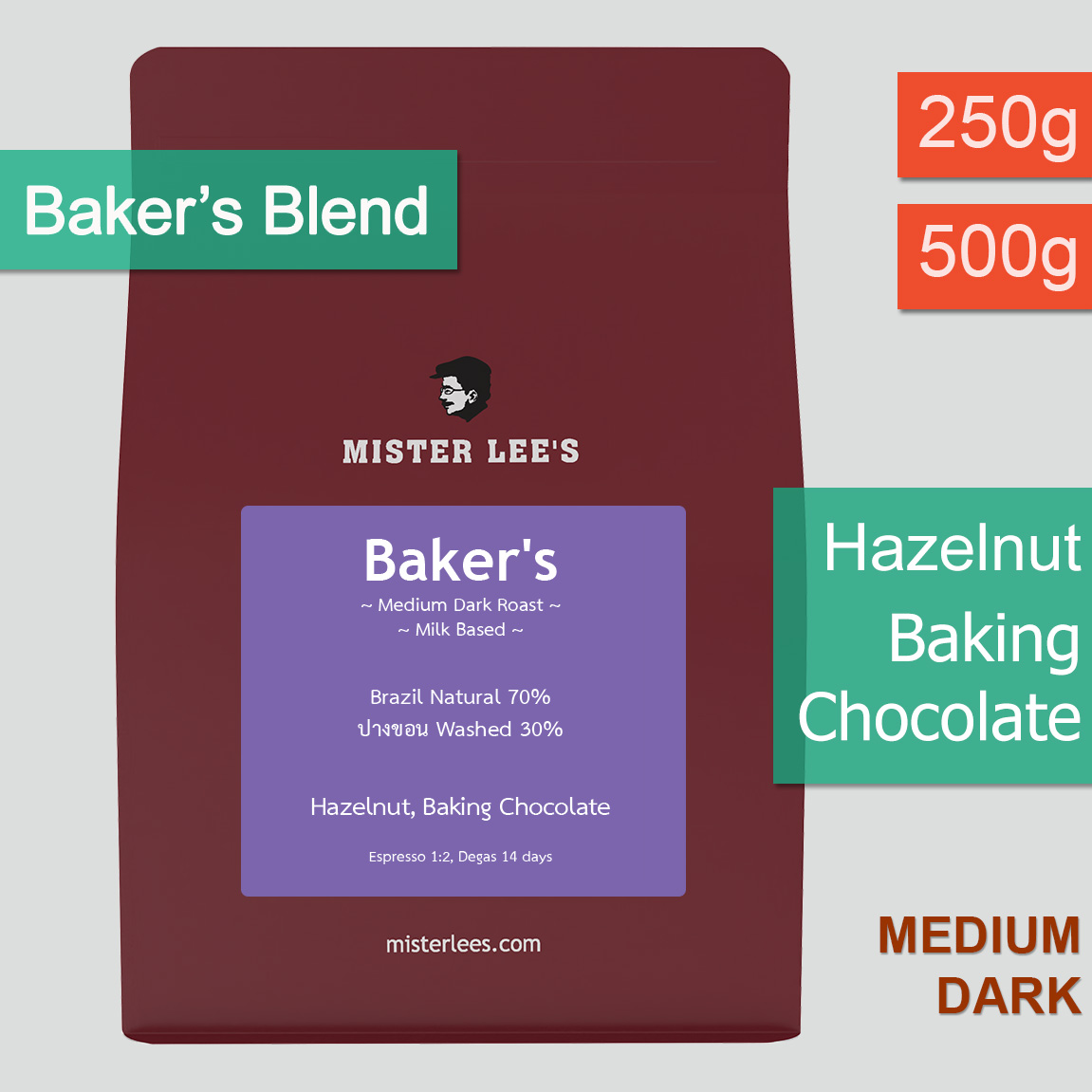 Baker’s Blend ใช้กาแฟ Brazil Natural ที่ให้กลิ่นหอมคล้าย Hazelnut ผสมกับกาแฟ ปางขอน washed คั่วระดับ Medium Dark เพื่อให้กาแฟมีน้ำหนักและรสจัด เหมาะสำหรับทำกาแฟร้อนใส่นม และกาแฟเย็น