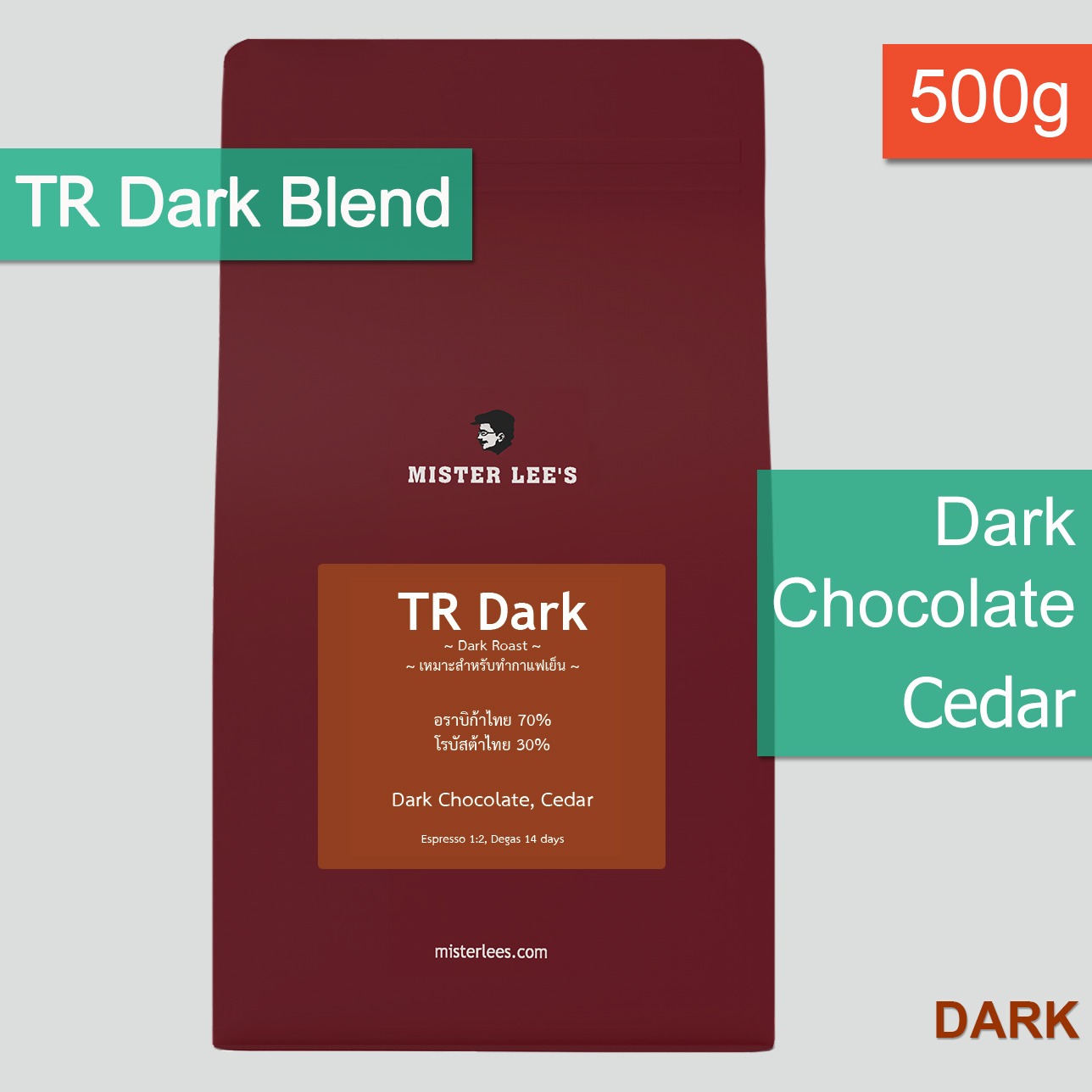 TR Dark เป็นเบลนด์กาแฟที่มิสเตอร์ลีพัฒนาขึ้นมาโดยมีวัตถุประสงค์ที่ชัดเจนคือเป็นกาแฟคุณภาพราคาประหยัดโดยเน้นไปที่การชงกาแฟเย็นเป็นหลัก ดังนั้นเราจึงได้เฟ้นหากาแฟอราบิก้าที่มีลักษณะเด่นเหมาะกับการชงกาแฟเย็นรวมไปถึงกาแฟโรบัสต้าที่สะอาดและดีทำให้กาแฟออกรสเต็มตลอดช่วง เพื่อให้เหมาะกับวัฒนธรรมการดื่มกาแฟเย็นในบ้านเรา กาแฟจะต้องให้รสจัดเข้มข้นและยังคงเอกลักษณ์ของรสกาแฟเมื่อนำมาผสมส่วนผสมที่เป็นนมข้นหวานนมข้นจืดรวมไปถึงส่วนผสมประเภทต่างๆ โดยเฉพาะร้านกาแฟทั่วไปที่ใช้แก้วกาแฟ 22 oz.